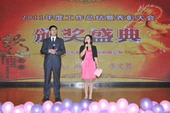 大會(huì )現場(chǎng) 財務(wù)部經(jīng)理馮小龍和網(wǎng)絡(luò )部李文芳主持了此次盛典
