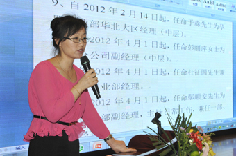 接下來(lái),人力資源部經(jīng)理于鳳仙女士上臺宣讀了《2012年機構調整及人事任免決定》。隨后,湯經(jīng)理上臺為新任命的12名管理人員頒發(fā)了任命書(shū)。接過(guò)紅燦燦的任命書(shū),同時(shí)也接過(guò)一份沉甸甸的責任,大家紛紛表示:一定不辜負公司領(lǐng)導的重托與信任,在新的崗位一定會(huì )再接再厲,繼續努力,為公司發(fā)展做出更大的貢獻!