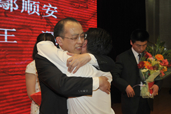 湯經(jīng)理與忠誠敬業(yè)貢獻獎獲獎人員熱情擁抱 湯經(jīng)理與忠誠敬業(yè)貢獻獎人員合影