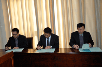 簽訂監管承諾書(shū) 杜經(jīng)理與其他兩位公司代表上臺領(lǐng)取獎牌