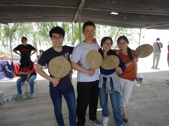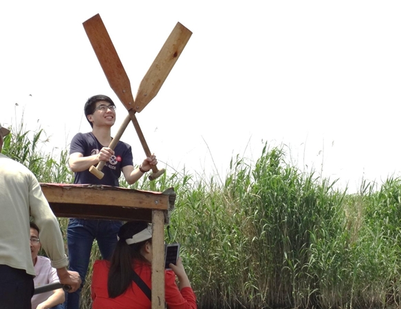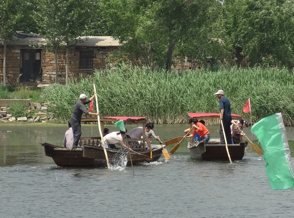 在豐盛的全魚(yú)宴之后,我們迎來(lái)了本次東平湖之游中最為有趣的項(xiàng)目——劃船比賽。比賽有4隊(duì)參賽,分別經(jīng)過(guò)初賽和決賽,最后決出總冠軍。為公平起見(jiàn),每隊(duì)由3男2女組成,船家掌控方向,隊(duì)員負(fù)責(zé)劃槳,第一個(gè)到達(dá)終點(diǎn)的隊(duì)獲勝,在一聲嘹亮的號(hào)聲中兩隊(duì)出發(fā),岸邊隊(duì)友們擊鼓吶喊助威,隊(duì)員們個(gè)個(gè)奮力向前劃,木漿濺起的水花打到后面隊(duì)員的臉上、衣服上、眼鏡上,顧不了那么多了,只有使勁向前劃。這樣的場(chǎng)景可樂(lè)壞了撐船的船家,笑聲、加油聲、擊鼓聲、號(hào)子聲讓整個(gè)比賽異常激烈。兩輪比賽之后船家為獲勝團(tuán)隊(duì)頒發(fā)了東平湖紀(jì)念品——手編蘆葦扇,手編的小扇扇起了無(wú)限的清涼。