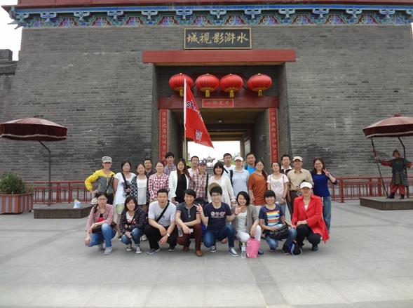 下午14:00,在泛舟東湖之后我們來(lái)到電視劇新版《水滸傳》的拍攝基地水滸影視城,在導(dǎo)帶領(lǐng)大家參觀了東平府、拜訪了武大郎家,路過(guò)了武大郎第一次遇到潘金蓮的二層小樓,觀賞了當(dāng)?shù)貞虬嘧颖硌莸穆短鞈蚯岔懥似砀g?,就差一套古代的服裝了,否則我們是真真的穿越到了水滸古鎮(zhèn)。