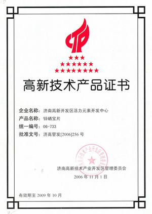 高新技術(shù)產(chǎn)品證書—鋅硒寶