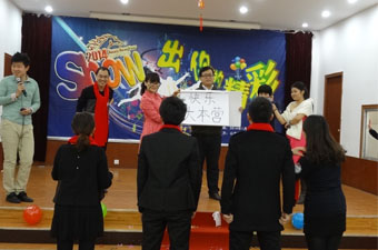 本次聯(lián)歡會以紅、黃、藍、綠四隊隊長的紅毯秀開場,紅隊的情景劇《新上海灘》令全場振奮、吶喊不斷;黃隊的紅毯走秀使人倍感溫馨;藍隊帥氣新郎和美麗新娘的婚禮秀氣氛高漲;綠隊的搞笑版《過河》更是令人捧腹不禁,揭開了整場聯(lián)歡會熱烈、熱鬧的序幕!在現(xiàn)場雷動的掌聲中,主持人宣布聯(lián)歡會正式開始,禮炮齊鳴,彩帶紛飛。